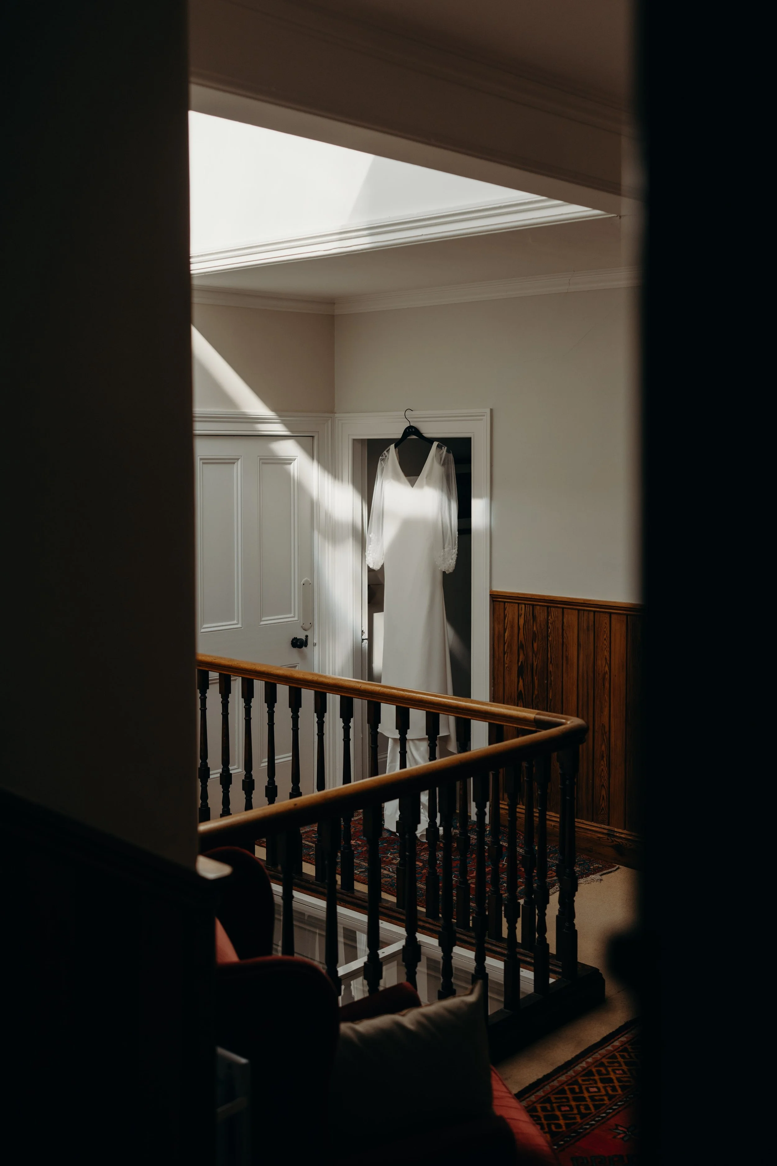 A white wedding dress hanging from a black hanger on a doorframe with sunlight streaming through a skylight.