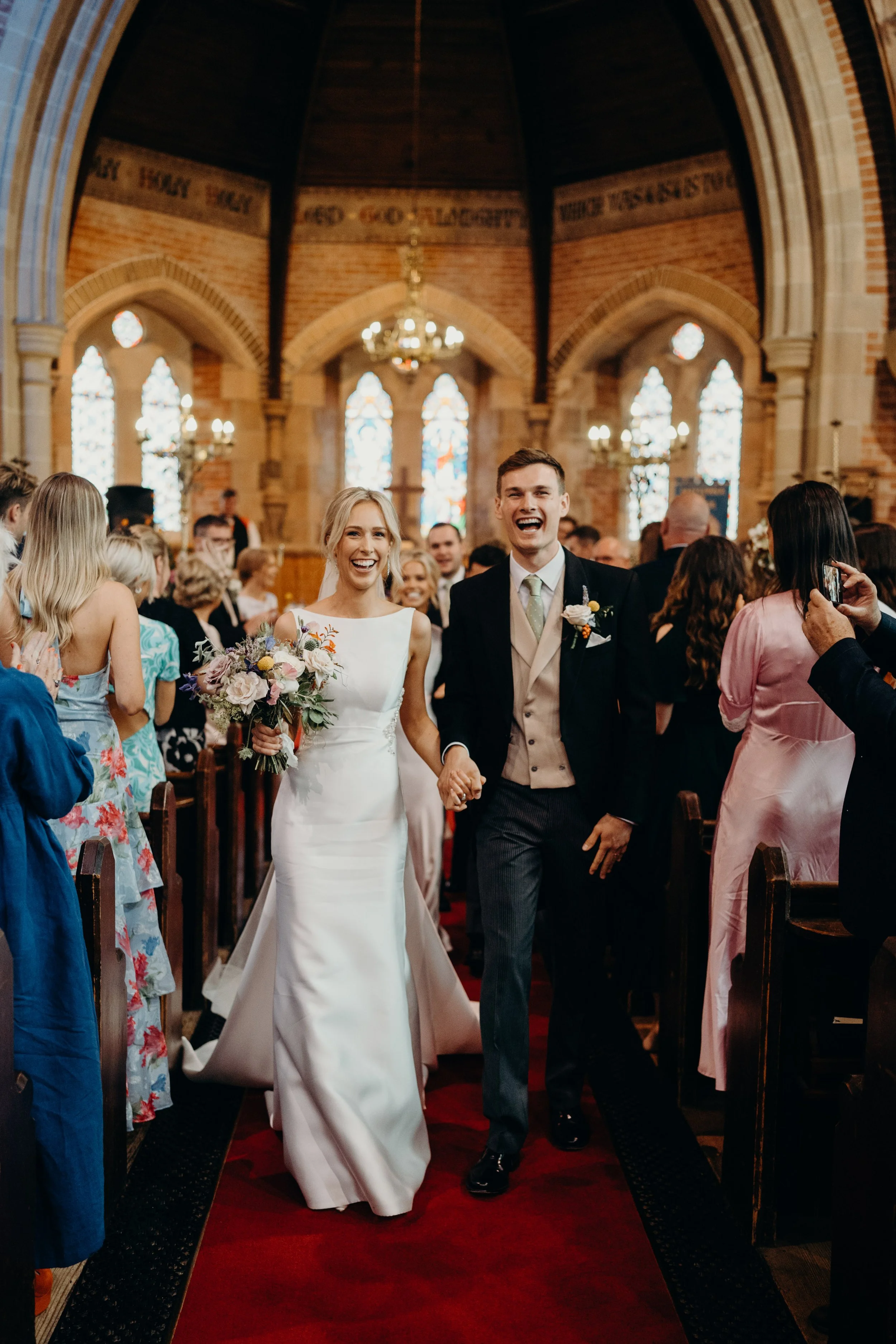 A bride and groom walking down the aisle of a church, smiling and holding hands, with guests clapping and taking photos.