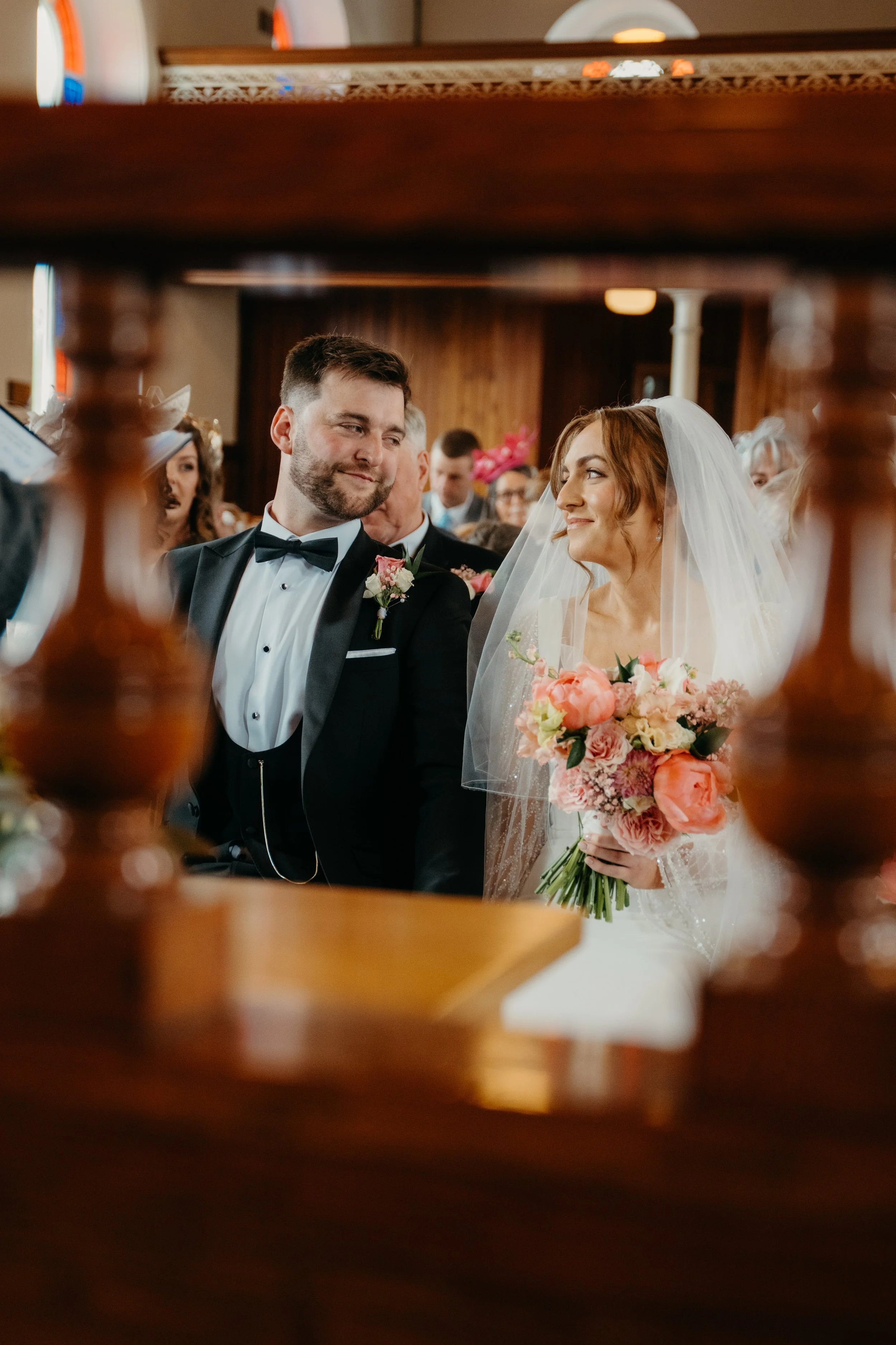 A bride and groom sitting during their wedding ceremony, seen through a wooden barrier, with the bride holding a bouquet of pink and white flowers, both smiling at each other.