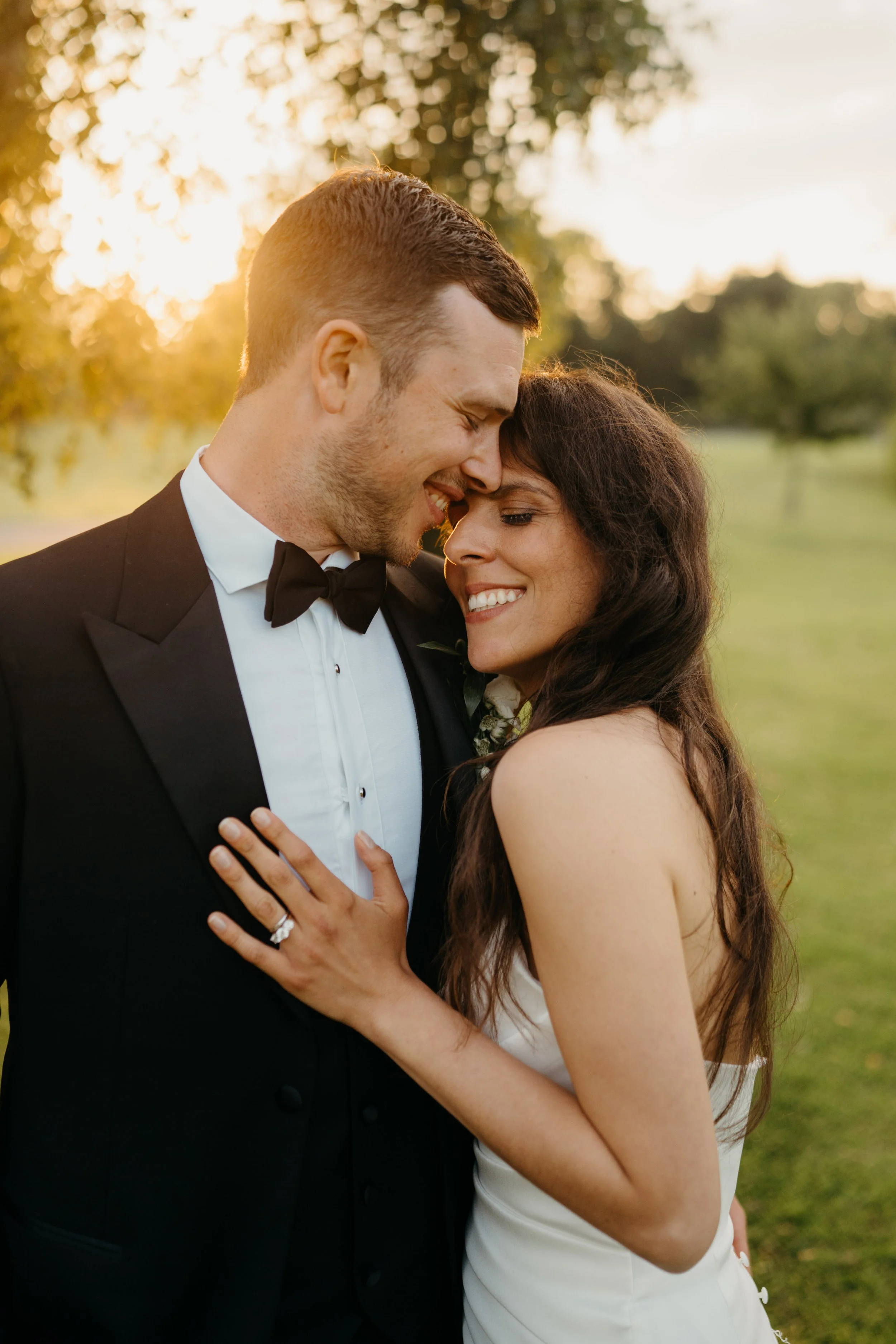 A newlywed couple shares a tender moment outdoors during sunset, with their foreheads touching and eyes closed, smiling. The groom wears a tuxedo and the bride wears a white dress with long, dark hair.