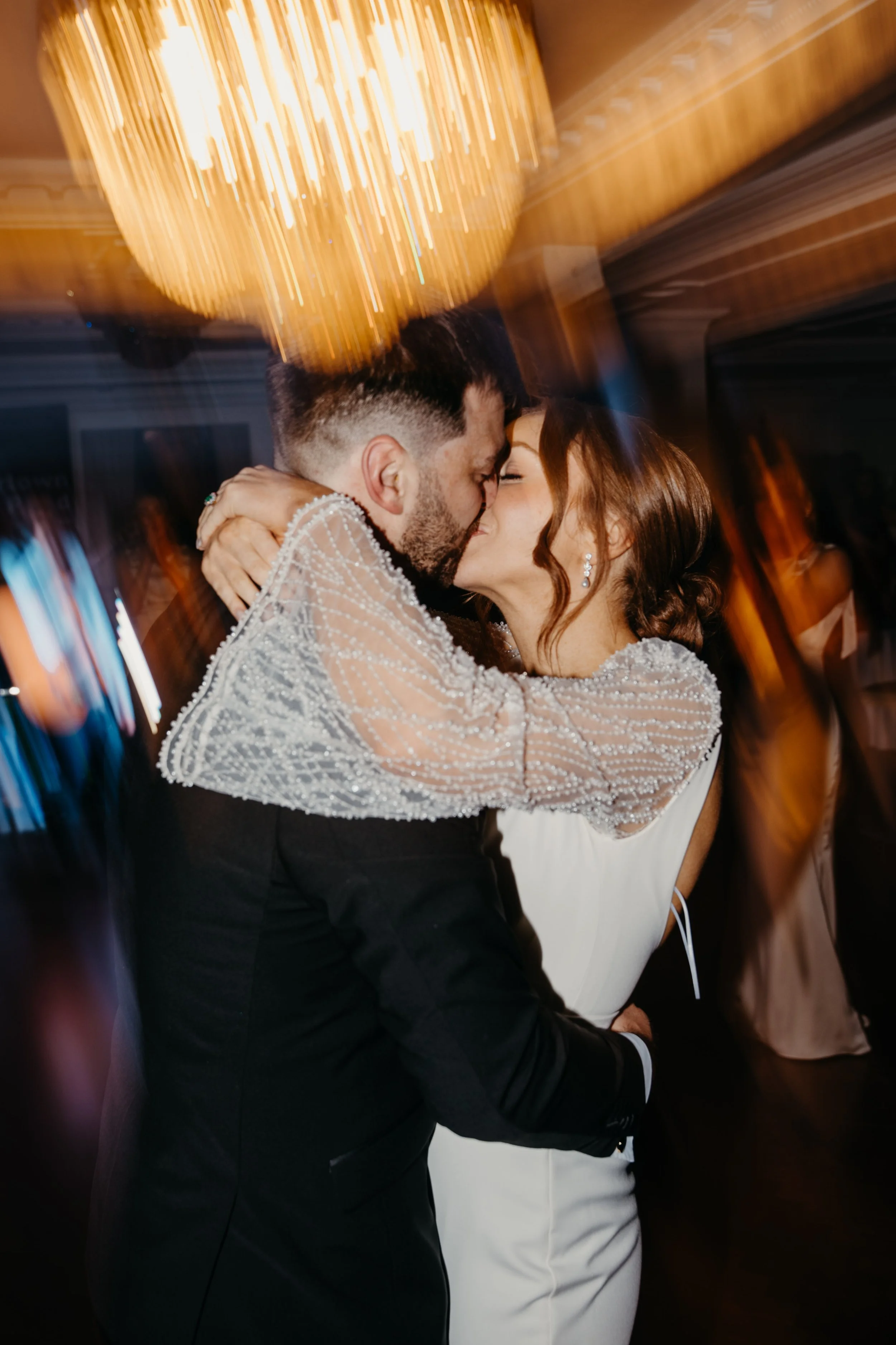 A couple sharing a kiss at a wedding reception, with warm lighting and a blurred background.
