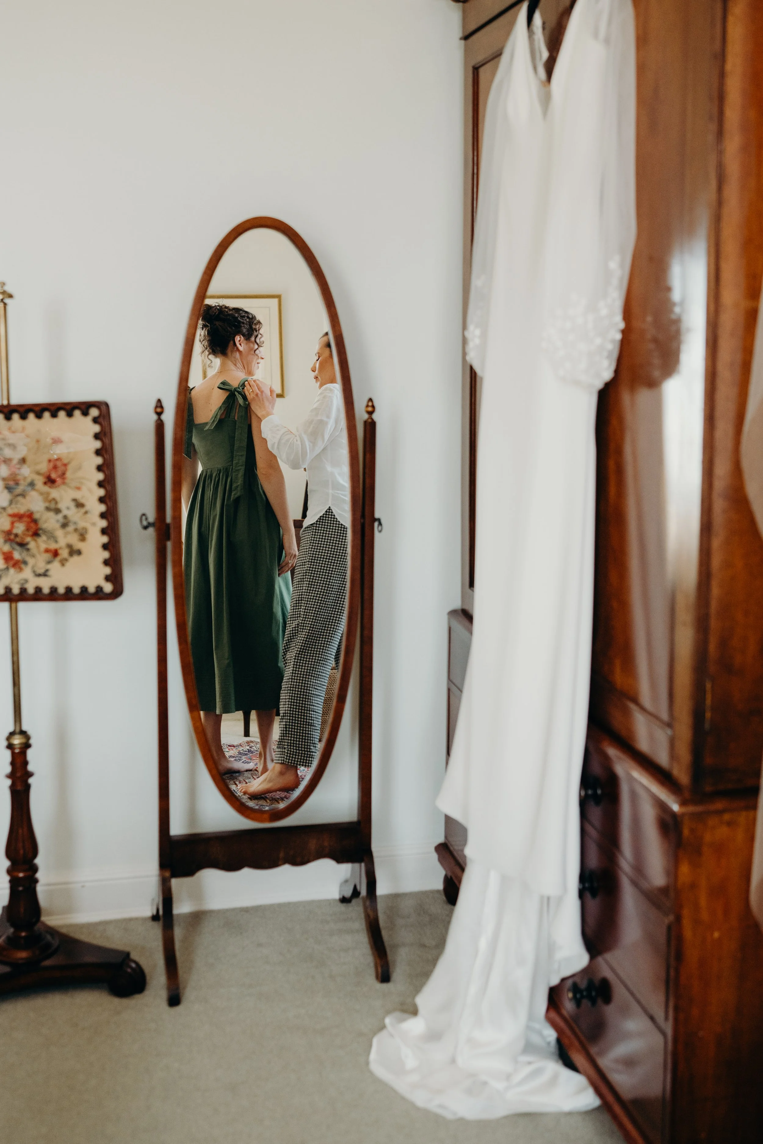 Two women are reflected in an oval mirror; one is helping the other with her dress. The scene is in a bedroom with vintage furniture, including a wooden wardrobe and a tapestry on a stand, and white and patterned clothing hanging nearby.