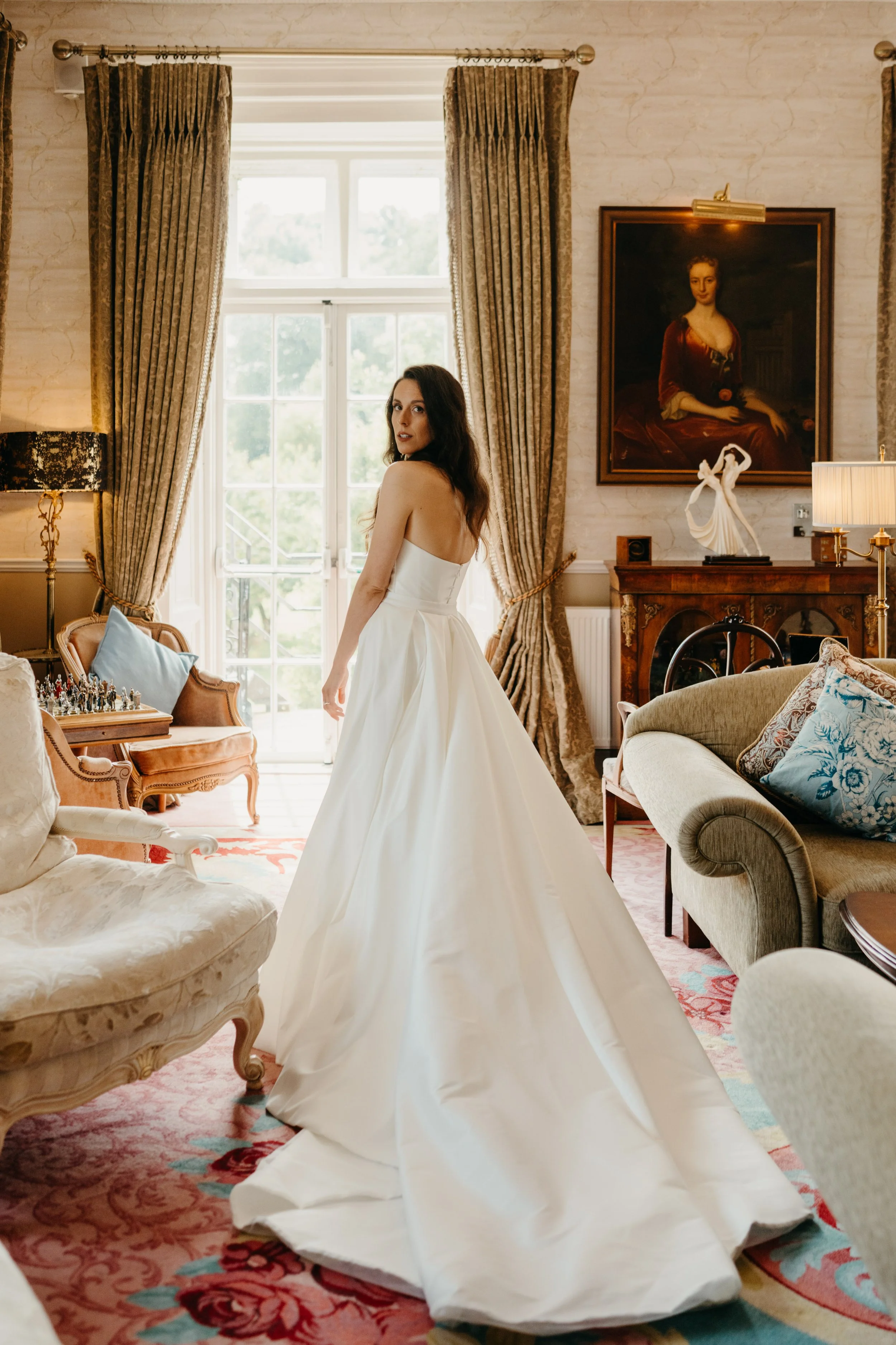 A woman in a strapless white wedding gown standing in a richly decorated living room with vintage furniture, large window with gold curtains, and artwork on the walls.