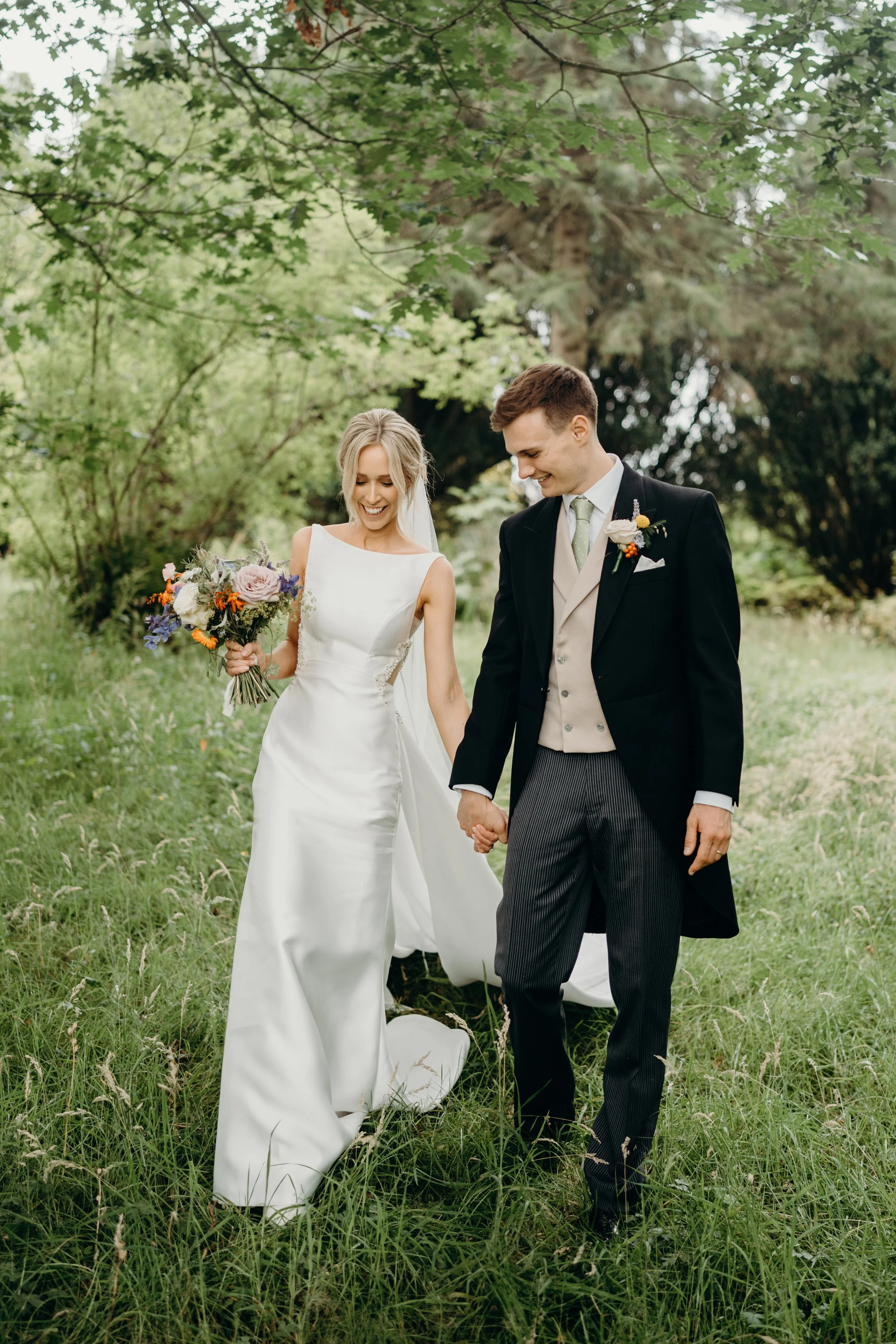 Bride and groom holding hands and walking through a grassy field under trees on their wedding day, smiling happily.
