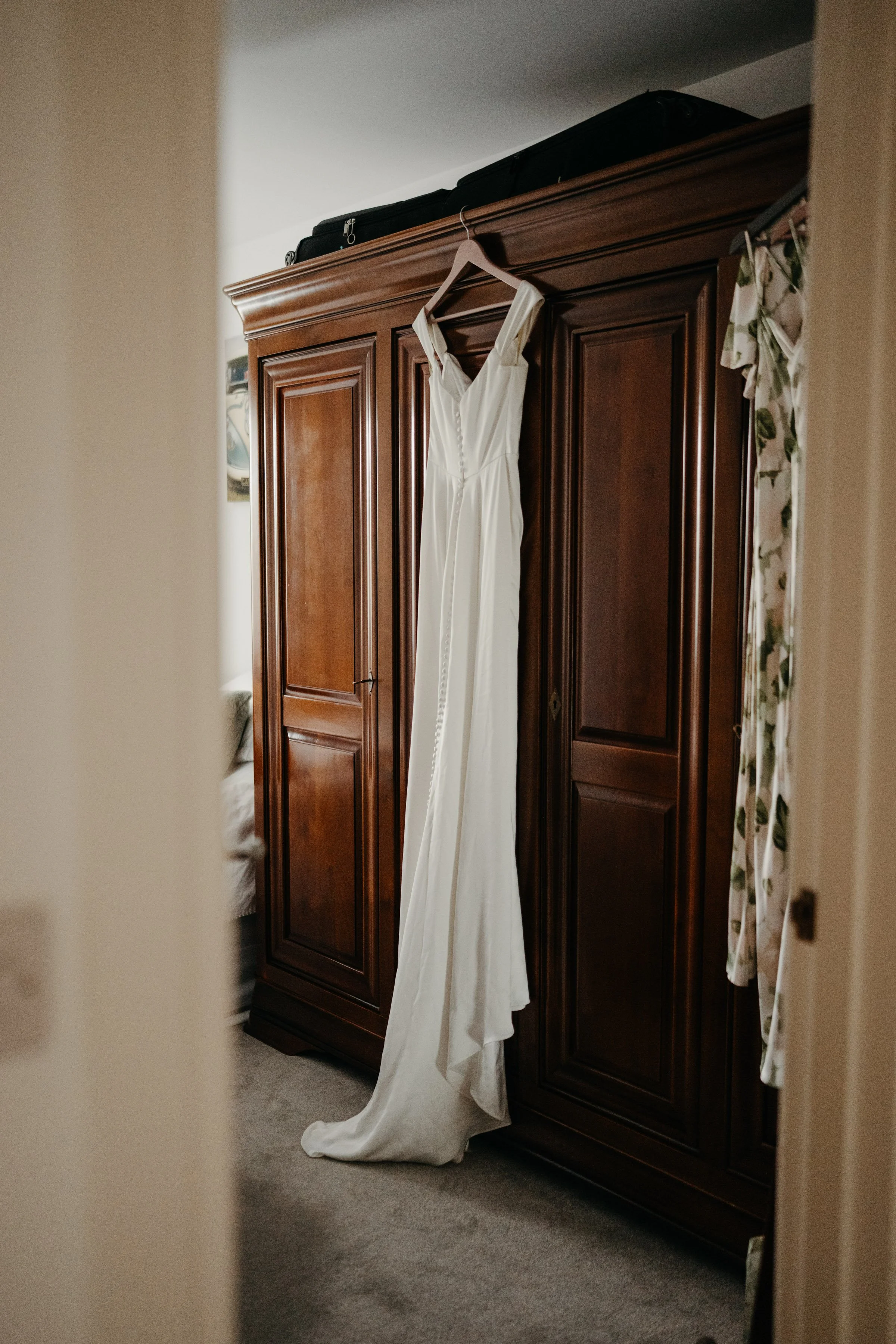 A white wedding dress hanging on a door inside a room with a wooden floor and a window in the background.
