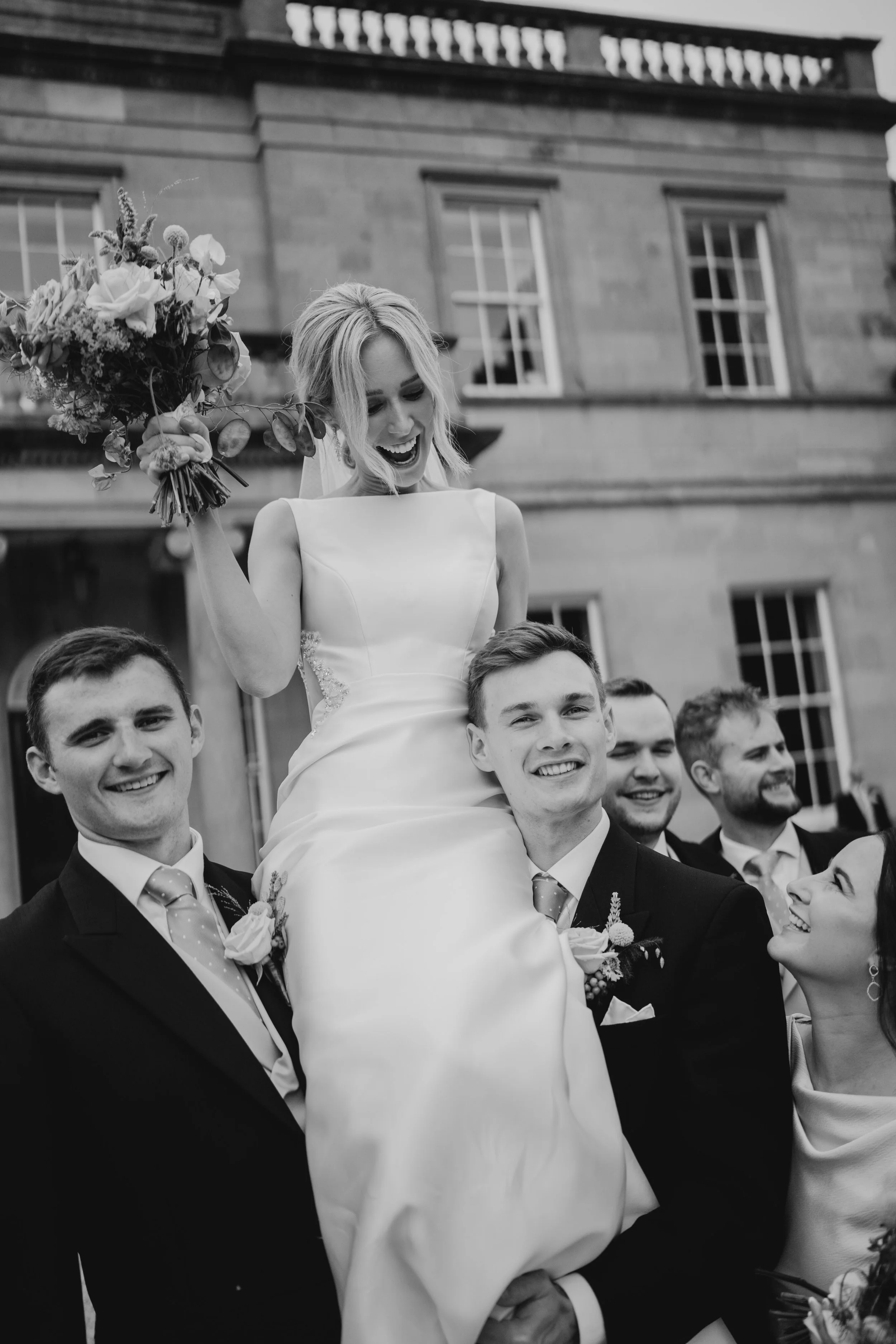 Black and white photo of a bride being lifted on shoulders by groomsmen outside a large stone building, with everyone smiling and celebrating.