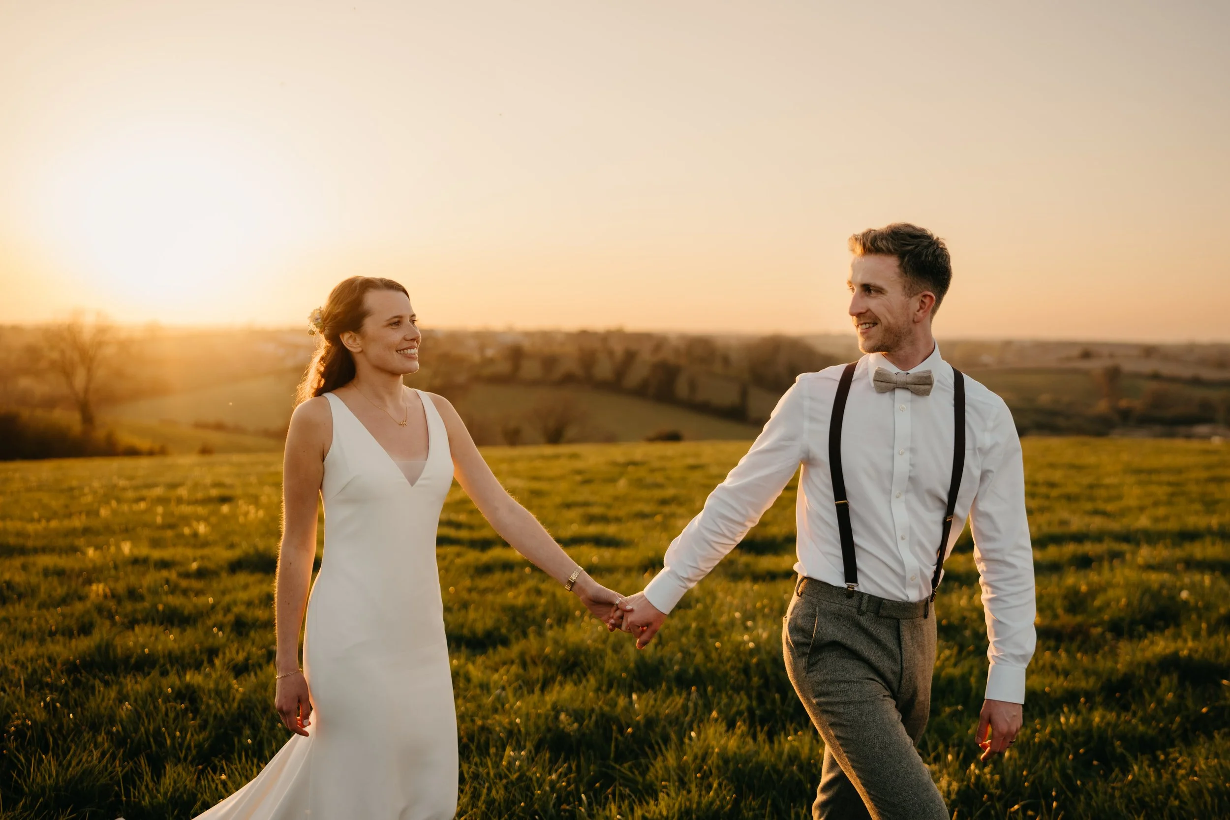 A bride and groom holding hands in a field during sunset, smiling at each other, with the sun setting behind them and rolling hills in the background.