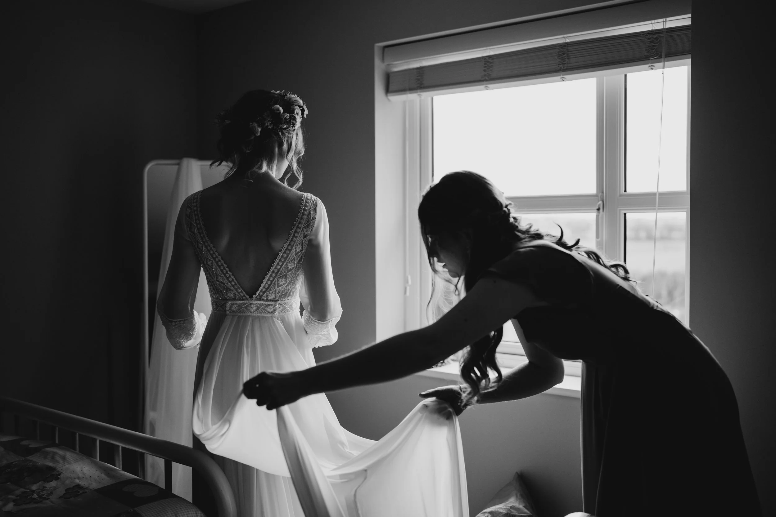 A bride in a wedding dress standing by a window, with a woman helping her with the dress, in a room with soft natural light.