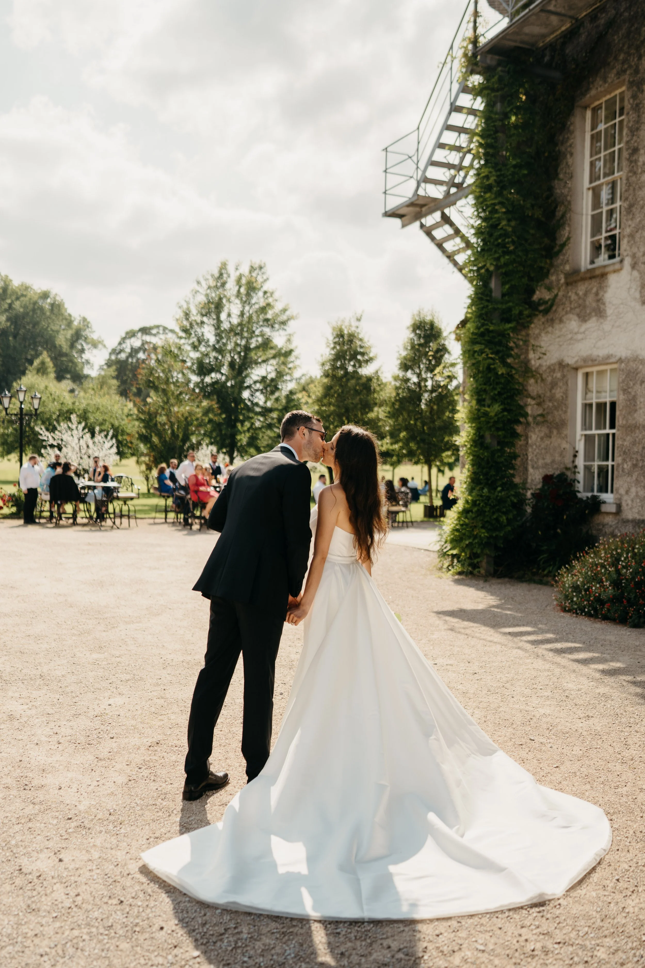 Bride and groom kissing outdoors at their wedding ceremony, with guests seated at tables under trees in the background.