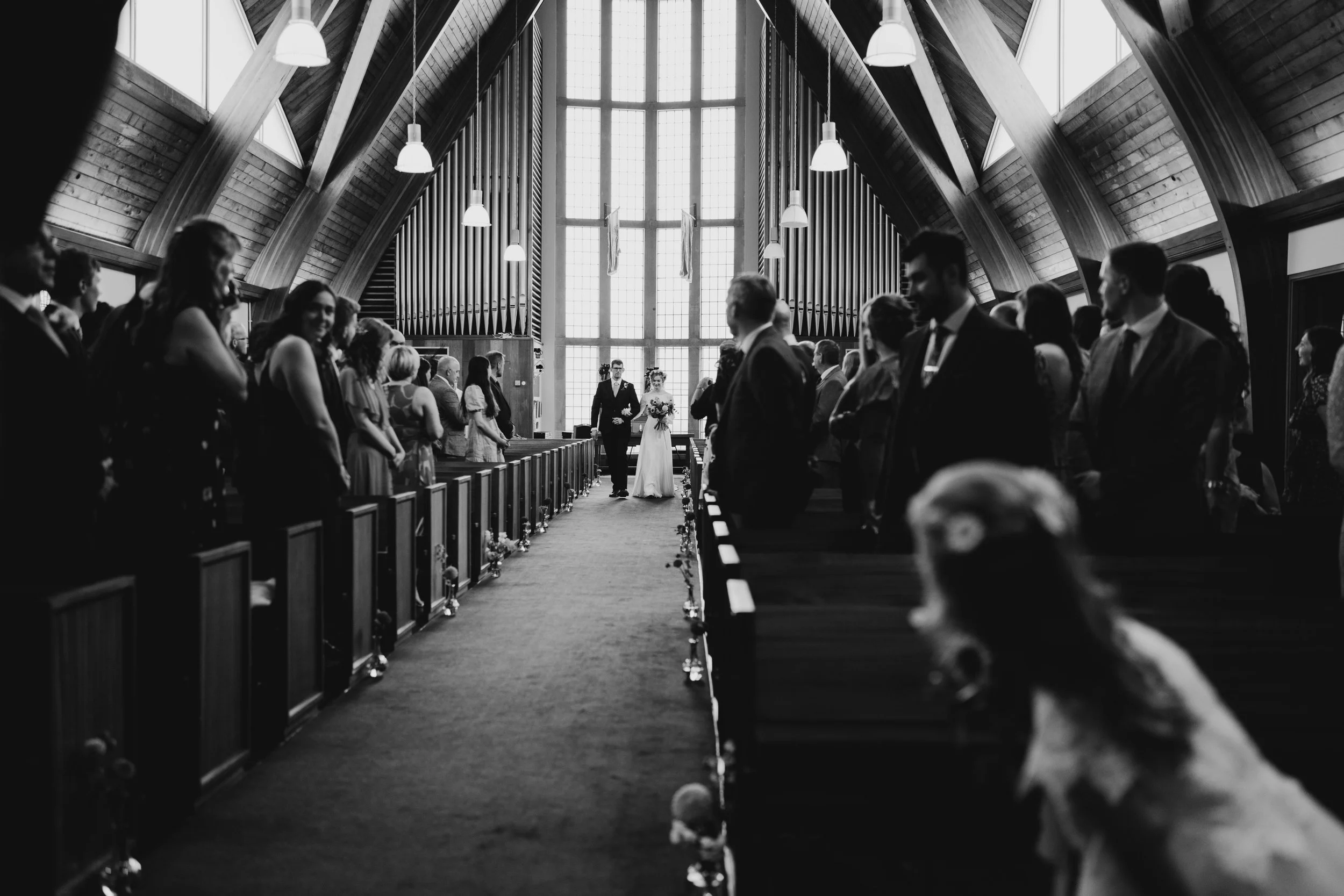 A black and white photo of a wedding ceremony inside a church with high, wooden vaulted ceilings and large stained glass windows. The bride and groom walk down the aisle while guests stand on either side watching.