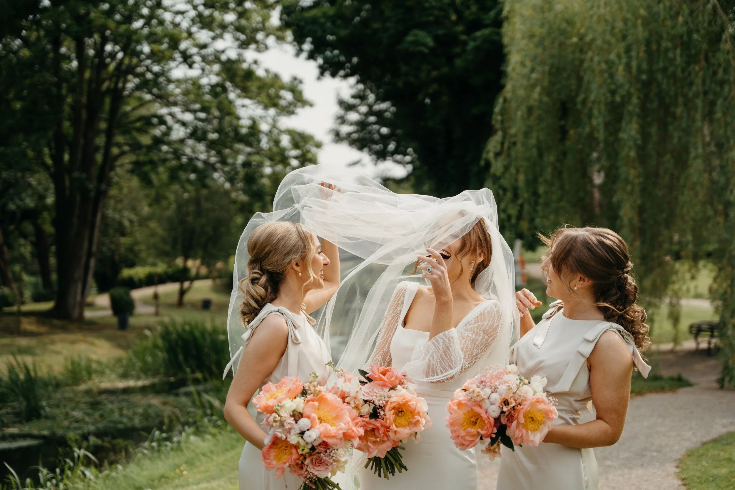 Bride in a white wedding dress and veil smiling with two bridesmaids in cream dresses holding pink and white bouquets in a park.