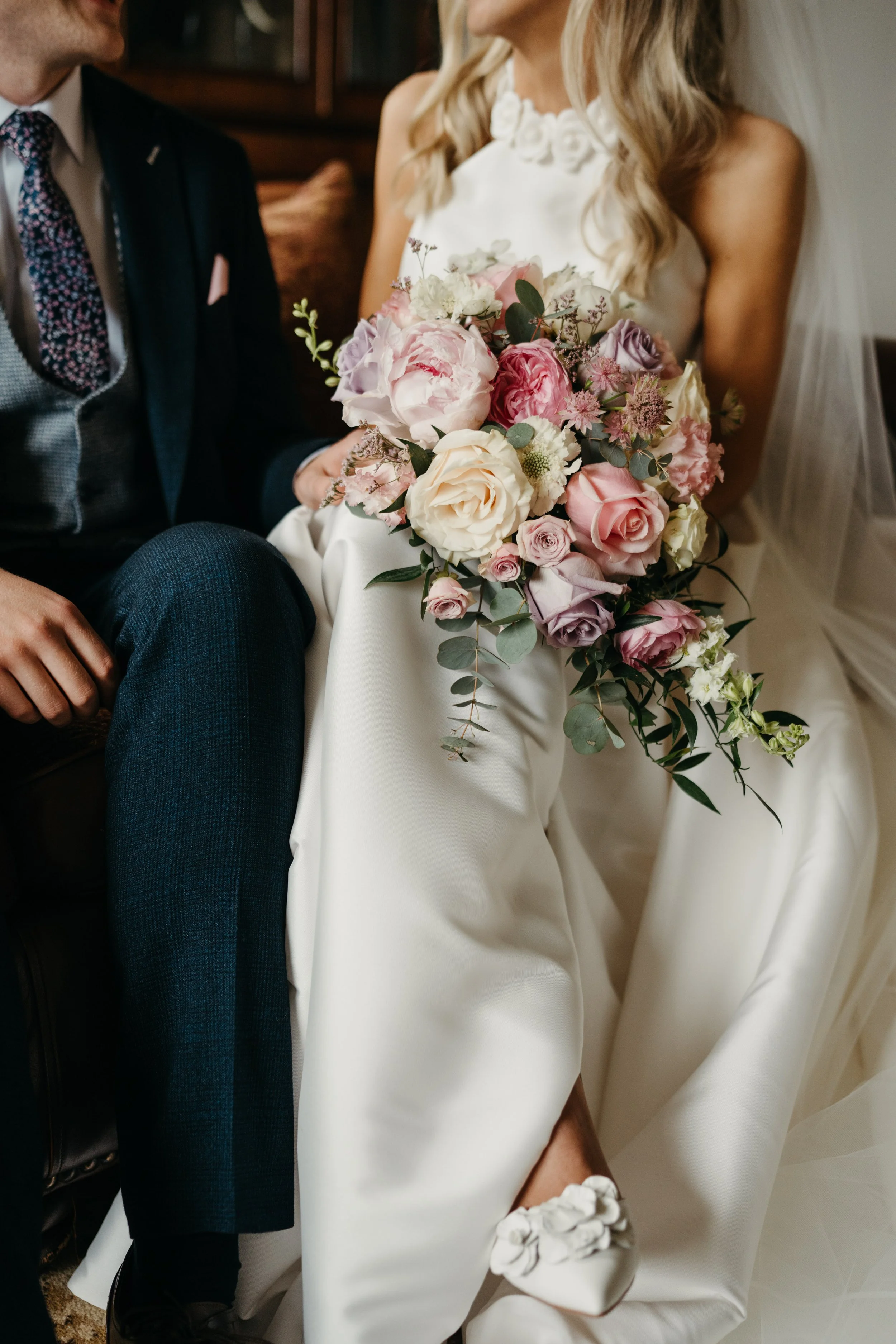 Bride in a white dress holding a large bouquet of pink, white, and purple flowers, sitting next to a man in a suit. Focus on the bouquet and partial view of their outfits.