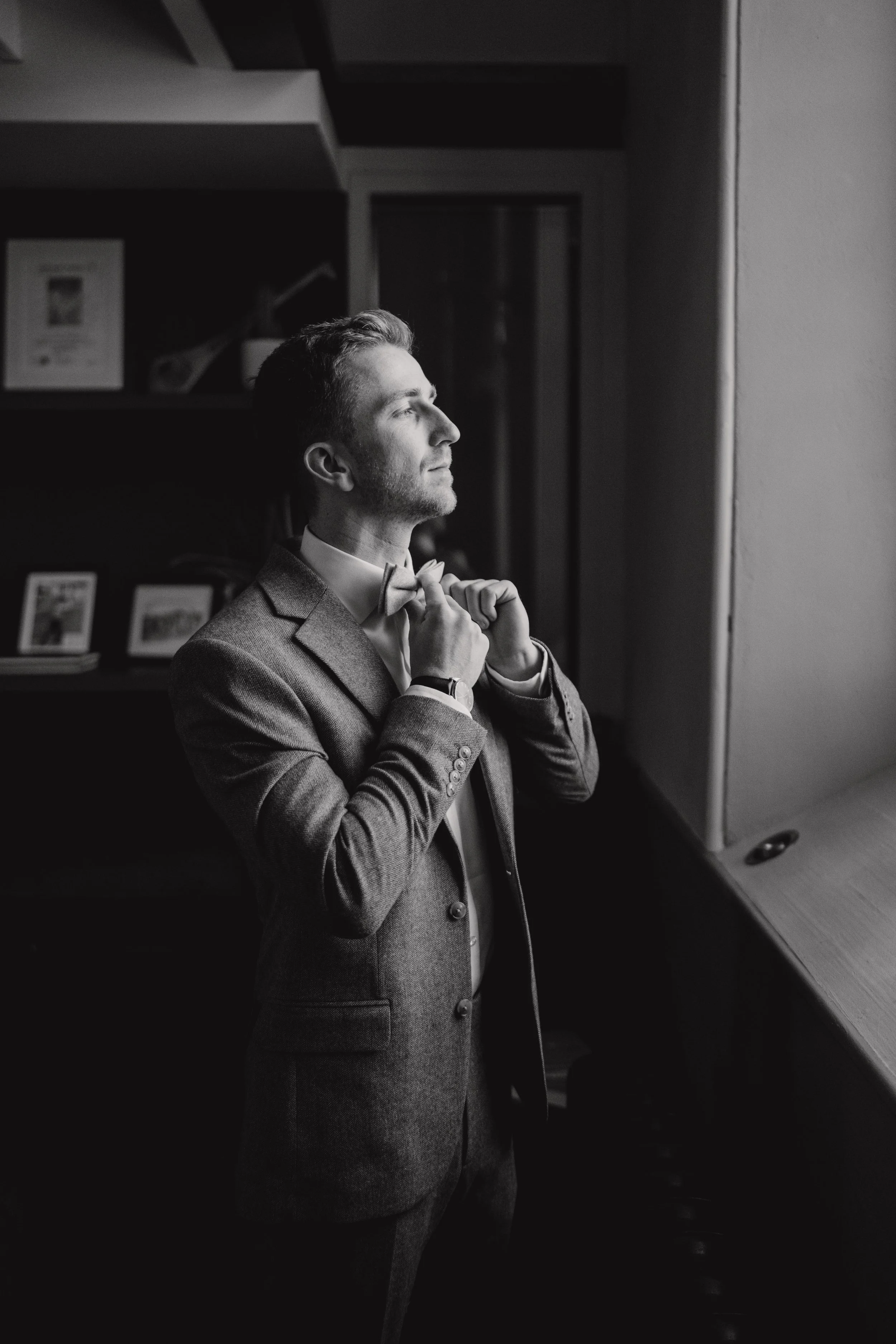 Black and white photo of a man in a suit adjusting his bowtie, standing near a window, with shelves and framed photos in the background.
